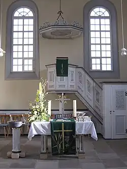 Im einschiffigen Inneren sind die Chorpfeiler mit reichem Kapitellschmuck (Palmetten, Köpfe, Sitzfiguren) ebenfalls noch romanisch.