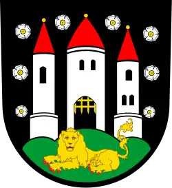 Blasonierung: „Auf grünem Dreiberg, der mit einem liegenden, herschauenden goldenen Löwen belegt ist, in Schwarz drei rot bedachte silberne Spitztürme, der mittlere mit offenem Tor und goldenem Fallgatter, umgeben von acht silbernen Rosen mit goldenem Kelch.“[19] |