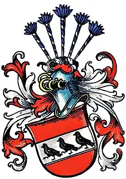 Blasonierung: In Rot ein silberner Balken belegt mit drei schwarzen Vögeln. Auf dem schwarz-silbern bewulsteten Helm fünf blau-silbern geringelte Stäbe oben mit blauen Federn besteckt. Die Helmdecken sind rot-silbern.[4]