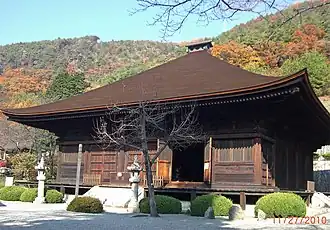 Die Haupthalle (本堂, Hondō) wurde während der Kamakura-Zeit von der Regierung vom 9. Shikken, Hōjō Sadatoki (北条 貞時; 1272–1311), auf Wunsch des Kaisers Go-Uda wieder aufgebaut. 1286 wurden die Pfeiler errichtet, 1290 war der Tempel fertiggestellt. Er ist damit der älteste Tempel in der Präfektur im sogenannten japanischen Stil und ist als Nationalschatz registriert. Die Haupthalle hat eine Seitenlänge von 5 Ken (etwa 18 m) und ist mit einem einfachen Pyramiden-Dach gedeckt. An der Frontseite sind zwischen den drei mittleren Zwischenräumen zwischen den Säulen Türen eingelassen, die sich nach beiden Seiten öffnen lassen. Rechts und links außen sind Renji-mado (連子窓), eine Art Gitterfenster, eingesetzt. An den Seiten sind rechts und links im ersten Säulenzwischenraum und auf der Rückseite in der Mitte Türen eingelassen. Alle sonstigen Zwischenräume sind mit Brettern verschalt. Der gesamte Tempel ist von einem geländerlosen Umgang umgeben. Auf den starken runden Säulen sind zweistufige hölzerne Kapitelle angebracht, die die Last des Daches aufnehmen.
