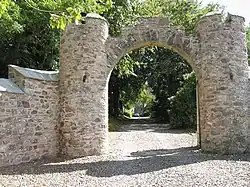 Die Gärten des Hauses sind von einer gewölbten Mauer aus rotem Sandstein-Bruchstein umgeben.[4]