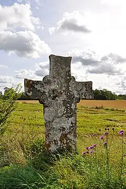 Zwei mittelalterliche Steinkreuze (schwedisch minneskors) finden sich im Kirchspiel, eines in der Nähe der Kirche und eines bei der Schule. Das Kreuz bei der Kirche soll 1430 am Todesort des Priesters Hans Krook errichtet worden sein. Das Kreuz bei der Schule soll an eine Braut erinnern, die auf der Fahrt zur Kirche vom Weg abkam und dabei umkam oder daran, dass zwei Personen sich ein Rennen lieferten, wobei einer vom Pferd viel und starb.[4] Angeblich soll es ein drittes Kreuz geben. Die beiden bekannten Kreuze haben runde Verbindungen zwischen den Kreuzarmen und erinnern entfernt an Ringkreuze.