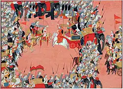 Die damāma (oder kuwarga) war ein sehr großes, die naqqāra ein kleineres Kesseltrommelpaar im naqqārakhāna, das gemäß der Auflistung im Ain-i-Akbari aus 63 Instrumenten bestand, von denen zwei Drittel Trommeln waren. Hinzu kamen Langtrompeten (karna und nafir), Kegeloboen (surna, später in Indien shehnai) und Handzimbeln (arabisch/persisch sanj). Für das 17. Jahrhundert bestätigen Miniaturmalereien,[7] dass Kesseltrommelpaare in der Mogulzeit die am meisten eingesetzten Instrumente im naqqārakhāna (naubat) waren.[8]