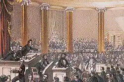 Am 31. März 1848 trat in der Paulskirche in Frankfurt am Main das sogenannte Vorparlament, eine beratende Versammlung von liberalen und demokratischen Politikern,[2] zusammen, das die Wahlen zur Nationalversammlung vorbereiten sollte. Während der vier Tage dauernden öffentlichen Debatte erhielten Frauen offiziell keinen Einlass. Am letzten Tag gelang es mehreren Frauen, darunter der Schriftstellerin Malwida von Meysenbug, der Frankfurter Bürgerin Clotilde Koch-Gontard und mehreren Ehefrauen von Abgeordneten, auf der Kanzel hinter schwarz-rot-goldenen Tüchern versteckt heimlich die Verhandlungen mitzuverfolgen.[3]