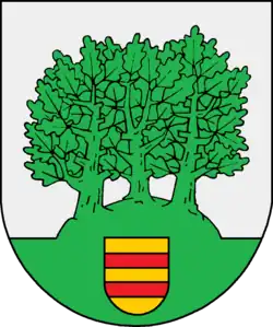 Blasonierung: „In Silber auf grünem Schildfuß ein grüner Hügel, der mit drei mit den Kronen ineinander gewachsenen grünen Eichen bestanden ist. Im Schildfuß ein in den Hügel ragender goldener Schild mit zwei roten Balken.“[4]