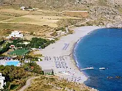 Während die Bucht bis in die 1980er Jahre fast unbebaut war, befinden sich heute an der Westseite das Hotel „Damnoni Bay“ und das darunter gelegene Urlaubsresort von Hapimag. Das an der Ostseite der Bucht geplante Minoan Prince Hotel ist mittlerweile eine Bauruine. Dazwischen liegen einige kleine Tavernen mit zum Teil gärtnerisch gestaltetem Außenbereich und Schatten spendenden Bäumen.