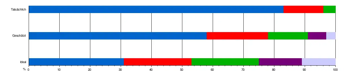 Von links nach rechts in Gruppen je 20 % der Gesamtbevölkerung: vermögendstes Quintil bis ärmstes Quintil der Bevölkerung. Die beiden ärmsten Quintile sind bei der tatsächlichen Verteilung aufgrund des geringen Wertes (viertes Quintil 0.2 %, fünftes Quintil 0,1 %) nicht sichtbar.