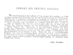 Sanders’ als Buch 1885 erschienenes Ergänzungs-Wörterbuch[15] bot dann in gleicher Weise die sprachlichen Veränderungen ab 1865, aber auch weitere Funde und Belege zu seinem großen Wörterbuch. Mit seinem Untertitel Vervollständigung und Erweiterung aller bisher erschienenen deutsch-sprachlichen Wörterbücher einschließlich des Grimm’schen stellte der Lexikograph seine Arbeit selbstbewusst gegen das Grimm’sche Werk und die ihn ablehnenden Universitätsgelehrten.
