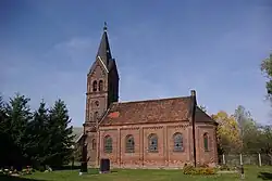 Das heutige Kirchengebäude ist ein neuromanischer Saalbau aus Backstein mit halbrunder Apsis im Osten und einem eingezogenen Turm im Westen. An dem Turm befinden sich Annexe. Die Mauern der Kirche sind mit Lisenen und Rundbogenfriesen gegliedert. Der Turm ist dreigeschossig und schließt über vier Dreiecksgiebeln mit einem vierseitigen Spitzhelm ab. Die bauzeitliche Ausstattung im Inneren ist fast vollständig erhalten, nur vom Altaraufsatz sind lediglich Reste vorhanden. Weitere Ausstattungsgegenstände sind eine Taufe, eine Kanzel aus dem Jahr 1885 und das Gemeindegestühl mit Westempore. Im Jahr 1967 wurde der Teil unter der Empore als Winterkirche abgetrennt.