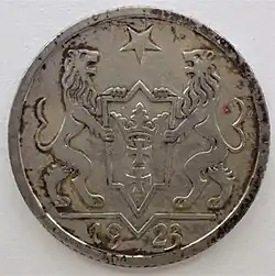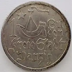 Der Danziger Gulden war von 1923 bis 1939 die Währung der Freien Stadt Danzig. Er war unterteilt in 100 Pfennig. Bereits in den vorherigen Jahrhunderten hatte Danzig in eigener Münze gerechnet und teilweise auch geprägt. Zwischen 1809 und 1812 prägte Danzig den Groschen und den Schilling (1 Groschen = 3 Schillinge) als Kupfermünzen.[1] Im 18. Jahrhundert wurden auch Dukaten (aus Gold), 2 Guldenstücke, 18 Groschen und VI Groschen (aus Silber) sowie Groschen und Schillinge aus Kupfer geprägt.[2]