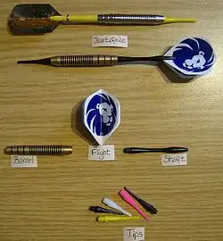 Jeder Spieler hat drei Pfeile, Darts genannt. Darts bestehen aus einer Spitze, dem Barrel, dem Schaft (engl. Shaft) und einem Flight. Letzteres sind schmale Flügel oder Blättchen, die den Wurfpfeil auf Kurs halten. Man unterscheidet zwei Arten von Darts: Steel- und Soft-Darts.