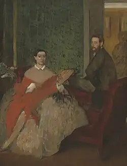 Um 1895 schuf Degas zwei Porträts seiner Schwester Thérèse mit ihrem Mann Edmondo Morbilli. Dieser war ein Cousin ersten Grades und Sohn seiner verarmten, 1805 verstorbenen Tante Rose Adelaide (Degas) Morbilli, Herzogin von S. Angelo a Frosolone. Degas hatte in Öl hatte zunächst ein etwas zwangloseres Porträt des Ehepaars in einem ausgearbeiteteren Interieur begonnen. Dargestellt war seine Schwester in einem frühen Stadium ihrer Schwangerschaft. Nachdem sie ihr Kind verloren hatte, entschloss sich Degas zu einem neuen Porträt des Paars. Er wählte nun eine formellere Darstellung der beiden. Während Edmondo Morbilli in den Vordergrund gerückt ist, sitzen beide nebeneinander und „tragen den Verlust mit Würde“, schrieb Jean Sutherland Boggs.[1]