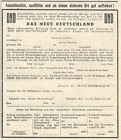 Um der angeblichen Freiheitsbewegung einen Anschub zu geben, wurden ab Herbst 1944 sogenannte Mitgliedskarten in die Zeitschrift eingedruckt, die man ausschneiden, ausfüllen und an einem sicheren Ort aufbewahren sollte. Personen, die zur Aufnahme als Kampf- und Gründermitglied in die Bewegung Das Neue Deutschland bereit waren, sollten sich nach dem Krieg und der daraus folgenden Befreiung erhebliche Vorteile verschaffen können. So wurden spätere Sondernahrungsmittel- und Sonderkleidungszuweisungen in Aussicht gestellt.