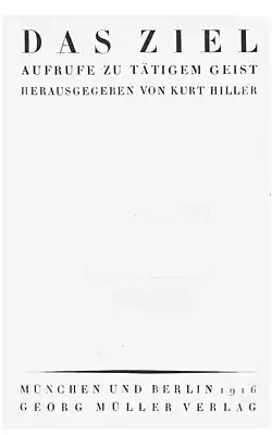 - Das Ziel. Aufrufe zu tätigem Geist. Hrsg. v. Kurt Hiller. Zweite Auflage. München; Berlin: Georg Müller Verlag, 1916.