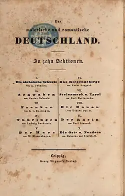 In den Jahren 1837–1850 erschien in Georg Wigands Verlag in Leipzig in erster Auflage die Buchreihe Das malerische und romantische Deutschland in zehn Ausgaben. Es waren Erzählungen und Reisebeschreibungen von Regionen im damaligen Deutschland, die mit der Reproduktion von Stahlstichen, nach Zeichnungen gestochen, bebildert wurden. Die Bücher aus dem Zeitalter der Romantik waren eine frühe Art von Reiseführern. Die aus 10 Bänden bestehende Buchreihe enthielt in der ersten Auflage insgesamt etwa 390 Stahlstiche.