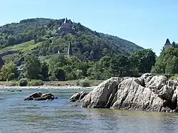 Wilhelm Meyer, Johannes Stets: Das Rheintal zwischen Bingen und Bonn. Borntraeger, Berlin 1996, ISBN 3-443-15069-1, S. 242 (=Sammlung geologischer Führer, Band 89). - ↑ Hartmann: Beschreibung der speciellen Aufnahme und Verpeilung des Rheinstrombettes in der Strecke von Bingen bis St. Goar zur Beseitigung der im Fahrwasser anstehenden, der Schifffahrt besonders hinderlichen Felsen unter Wasser. In: Zeitschrift für Bauwesen. Nr. 4, 1868, Sp. 231–252, hier Sp. 237 (zlb.de).