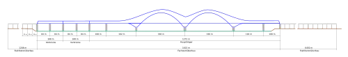 | Konstruktion | Kombination aus Durchlaufträgerbrücke mit Bögen und Spannbeton-Balkenbrücke | |