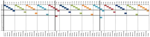 - ↑ Es gibt Monate mit 5 Freitagen, wie z. B. den September und Dezember 2017. Deshalb 5 und nicht 4 Freitagsbänder.