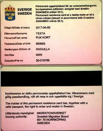 Daueraufenthaltskarte (englisch permanent residence card, spanisch tarjeta de residencia permanente, italienisch Carta di soggiorno permanente, französisch carte de séjour permanent, niederländisch Duurzame verblijfskaart) heißt das Aufenthaltsdokument, das im Europäischen Wirtschaftsraum für den Familienangehörigen eines freizügigkeitsberechtigten EWR-Bürgers ausgestellt wird, der nicht die Staatsangehörigkeit eines EWR-Landes, sondern eine Drittstaatsangehörigkeit besitzt, und das die Berechtigung für einen Daueraufenthalt in diesem Mitgliedstaat nachweist.