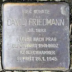 An David Friedmann, seine erste Frau, seine erste Tochter und Olga Schweitzer erinnern vier Stolpersteine vor dem Haus Paderborner Straße 9 in Berlin. Ein Logenbruder aus der Freimaurerloge Germania zur Einigkeit, der Friedmann seit 1922 angehört hatte,[1] sorgte für die Verlegung dieser Stolpersteine.[3]