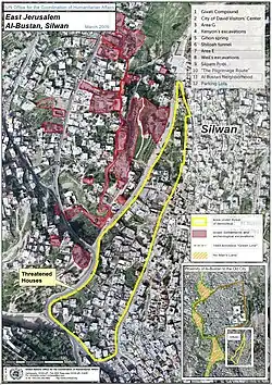Einer der Hintergründe dieser Entscheidung ist der, dass 1970 das Gebiet zum „archäologischen Park“ deklariert wurde, was weitere Ausgrabungen erleichterte und es für die Öffentlichkeit auch von Westjerusalem aus gut zugänglich machte. Gleichzeitig hatte die Erklärung zum „Park“ zur Folge, dass die Bewohner von Wadi Hilwa nur noch illegal in ihrer Heimat bauen konnten, palästinensische Gebäude mehrfach abgerissen wurden und Palästinensern hohe Geldstrafen für ihre Bauarbeiten auferlegt wurden.[5] Ein UN-Report von 2022 schätzt, dass 970 Palästinensern der Abriss von Wohnhäusern und Vertreibung droht.[6] Insbesondere ist seit 2010 geplant, große Teile Silwans zu demolieren, um als archäologische Attraktion einen „Königsgarten“ anzulegen (rechts: gelb).