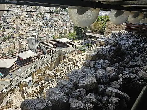 - Terrassen + Boden: jebusitisch > Steinstrukturen: Israelitischer Palast Davids. So deutet vor allem Eilat Mazar. Sie ist der Meinung, dass die Funde demnach ziemlich genau den biblischen Erzählungen entsprechen, muss dafür aber annehmen, dass die in der Bibel bezeugte und dem Palast Davids vorangehende Jebusiter-Festung archäologisch spurlos verschwunden ist.[29] Margreet Steiner vertrat ursprünglich in etwa dieselbe Interpretation,[30] denkt mittlerweile aber, dass die archäologische Evidenz „weder für die Rekonstruktion der Gestalt der [großen Steinstruktur] noch ihrer Funktion – Palast, Tempel, Tor? – noch für eine genaue Datierung“ ausreicht, und tritt stattdessen vor allem als Kritikerin des „kolonialistischen“ Ausgrabungsprojekts in Erscheinung.[31] Ansonsten haben sich nur wenige Archäologen dieser Interpretation angeschlossen – zum Beispiel aber jüngst Greg Wightman,[32] der bei seiner Deutung allerdings von mehreren hypothetischen Verteidigungsanlagen ausgeht und diese dann zum Kern seiner Argumentation macht.[33]