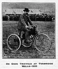 Bereits im Mai 1895 berichtete der Journalist und Autor Louis Baudry de Saunier (1865–1938) in der Zeitschrift L’Illustration über das De Dion-Bouton Tricycle.[9] Das Fahrzeug wurde am 15. Oktober 1895 auf einer Ausstellung in Tunbridge Wells präsentiert. Die Rahmen wurden von Clément und Decauville zugekauft.