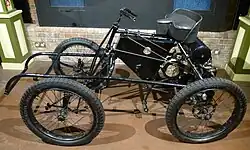 Eine weit verbreitete Lösung für diese Probleme war die Fahrzeugart Quadricycle. Anstelle des einzelnen Vorderrades ist eine Vorderachse montiert. Zwischen den Vorderrädern ist eine Ladefläche oder ein Sitz, was einen tiefen Schwerpunkt ergibt. Der originale Lenker bleibt erhalten. Lenkbarkeit und Stabilität sind in Ordnung.[2] Das Mehrgewicht ist überschaubar. Bedenken bezüglich der Sicherheit für den vorne sitzenden Passagier waren damals nicht oder kaum vorhanden.