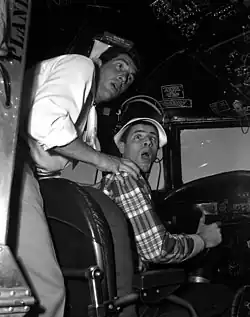 Ab 1949 übertrug Paramount Pictures das Format Martin & Lewis schließlich auf das Medium Spielfilm. Bis 1956 entstanden unter dem Produzenten Hal Wallis 16 abendfüllende Filme, die die bekannte Rollenverteilung zwischen Martin und Lewis in Rahmenhandlungen aus den Bereichen Militär, Marine, Showbusiness, Zirkuswelt oder Wilder Westen einbetteten.[Anm. 10] Thematisch ging es regelmäßig um Männerfreundschaften zwischen gegensätzlichen Charakteren, die durch verschiedene Zwischenfälle auf die Probe gestellt und schließlich doch bestätigt wurden. Die Filme waren dramaturgisch, handwerklich und technisch meist schlicht, teilweise sogar schlecht.[105] Dennoch waren sie regelmäßig Kassenerfolge, die teilweise höhere Gewinne einspielten als aufwendig produzierte Filme von Alfred Hitchcock.[106]