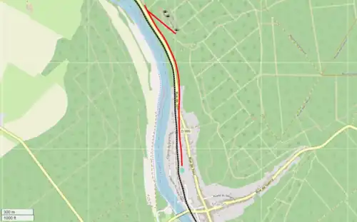 ![]() Ehemalige Trassen der Feldbahn (rot) und der Normal- spurbahn (schwarz-weiß) auf einer Karte von 2024 | |||||||||||||||||||||||||||||