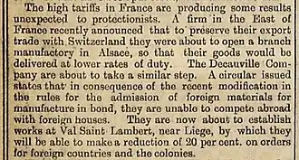 ↑The Economist, 30. Juni 1894, S. 801 „Eine Firma in Ostfrankreich kündigte kürzlich(Juni 1894) an, dass sie zur Aufrechterhaltung ihres Exporthandels mit der Schweiz eine Zweigfabrik im Elsaß eröffnen wird, damit ihre Waren zu niedrigeren Zollsätzen geliefert werden können…“ The Economist vom 30. Juni 1894, S. 801.