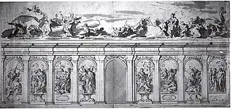Von diesen Arbeiten haben sich verschiedene Abbildungen erhalten. So eine in Dresden befindliche Zeichnung,[3] die einen Entwurf für eine Wand und das darüberbefindliche Deckengemälde wiedergibt. Eine in Köln befindliche Entwurfsskizze in Öl zeigt ein Teil des Deckengemäldes.[4] Auf einer bekannten, aber verschollenen Zeichnung sind auf zwei Teilen alle Details zu sehen.[5]
