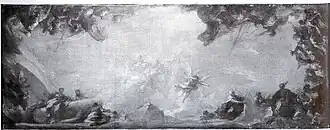 Das Deckenfresko im Deutschen Pavillon des Dresdner Zwingers wurde im Jahre 1725 von Giovanni Antonio Pellegrini gemalt. Beim Brand von 1849 wurde das Fresko vernichtet.