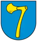 Blasonierung: „In Blau eine aufrecht gestellte bronzezeitliche, goldene Streitaxt, mit der Schneide nach rechts gekehrt.“[5] |