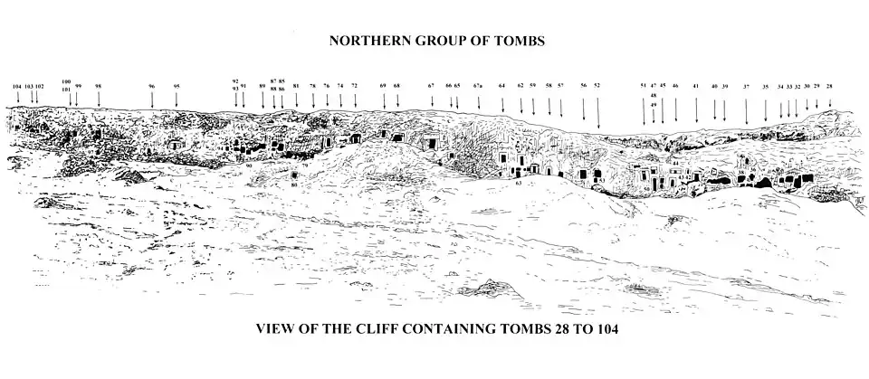 Deir el-Gebrawi ist namensgebend für eine nahe gelegene Nekropole aus pharaonischer Zeit. Die Nekropole verteilt sich auf zwei voneinander getrennte Felswände, das „Northern Cliff“ und das „Southern Cliff“. Während des ausgehenden Alten Reiches und vielleicht noch während der Ersten Zwischenzeit entstanden hier etwa 120 Felsgräber, von denen 16 bildliche Darstellungen und Inschriften besitzen.[2] Von besonderer Bedeutung sind die Gräber mehrerer Gaufürsten des 12. oberägyptischen Gaues, die teilweise auch andere sehr hohe Staatsämter wie das des Wesirs oder eines Vorstehers von Oberägypten bekleideten. Zu diesen Gräbern zählen in der südlichen Gruppe die des Ibi und des Djau, sowie in der nördlichen Gruppe diejenigen von Henqu I., Hemre I., Henqu II. und Hemre II.