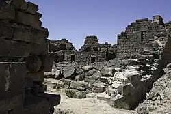 - ↑ René Dussaud, Frédéric Macler: Voyage archéologique au Ṣafâ et dans le Djebel ed-Drûz, Ernest Leroux, Paris 1901, S. 177–182: hier S. 178: „Vers le centre et formant bâtiment isolé le logement du commandant du camp.“