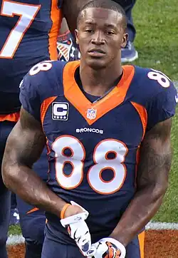 Er wurde von den meisten NFL Scouts als bester oder zweitbester Wide Receiver neben Dez Bryant eingeschätzt und von den Denver Broncos als 22. Spieler in der ersten Runde des NFL Draft 2010 ausgewählt. Am 31. Juli 2010 unterschrieb er einen Fünfjahresvertrag über 12,155 Millionen US-Dollar.[3] In seinem ersten NFL-Spiel fing er acht Pässe für 97 Yards und einen Touchdown gegen die Seattle Seahawks. Allerdings wurde er im Verlauf seiner Rookie-Saison von Verletzungen geplagt, wodurch er fünf Spiele verpasste. Somit kam er letztlich nur auf 283 Yards und zwei Touchdowns. Im Februar 2010 zog er sich einen Achillessehnenriss zu, wodurch die Saison 2011 in Gefahr geriet. Er erholte sich jedoch überraschend schnell und avancierte gegen Ende der Saison zur Lieblingsanspielstation von Broncos-Quarterback Tim Tebow, als er in den letzten sieben Spielen der Saison einen Franchise-Rekord für gefangene und auf ihn geworfene Pässe aufstellte. Vor der Saison 2012 wurde Peyton Manning für die Quarterbackposition verpflichtet, jedoch verpasste Thomas die Vorbereitung durch eine Operation. Die neue, auf das Passspiel ausgelegte Offensive kam ihm zugute, und er fing in dieser Spielzeit 94 Pässe für 1.434 Yards und zehn Touchdowns. Das brachte ihm seine erste Nominierung für den Pro Bowl ein. Die Broncos-Offensive der Saison 2014 war eine der besten der NFL-Geschichte, als Manning Rekorde für die meisten geworfenen Touchdowns und die meisten geworfenen Yards aufstellte.[4] Davon profitierte auch Thomas, der 92 Pässe für 1.430 Yards und 14 Touchdowns fing und wieder für den Pro Bowl nominiert wurde. Die Broncos erreichten Super Bowl XLVIII, wo sie gegen die Seattle Seahawks mit 8:43 verloren. Thomas gelang es jedoch, einen Rekord für die meisten gefangenen Bälle in einem Super Bowl aufzustellen, und das, obwohl er Berichten zufolge die meiste Zeit des Spiels eine ausgekugelte Schulter hatte.[5] Am 5. Oktober 2014 stellte er gegen die Arizona Cardinals einen neuen Franchise-Rekord auf, als er acht Pässe für 226 Yards fing.[6] Außerdem gelangen ihm in sieben Spielen in Folge jeweils mehr als 100 Yards Raumgewinn durch Passfänge, was ebenfalls einen Franchise-Rekord darstellt.