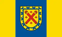 Blasonierung: „In Gold mit einem von Gold und Blau im Doppelwolkenschnitt geteilten Bord zwei schräg gekreuzte, an den oberen Enden rot-golden brennende rote Baumstämme, bewinkelt von vier roten Kleeblättern.“[12] |