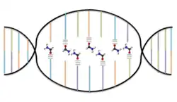 Bei Nukleinsäuren (DNA und RNA) bilden sich Wasserstoffbrücken zwischen den einzelnen Nukleotiden aus, was als Basenpaarung bezeichnet wird. Daraus ergeben sich Paarungsmöglichkeiten innerhalb einer Kette (wie z. B. bei tRNA) oder zwischen zwei Ketten (wie z. B. bei einer DNA-Doppelhelix). Doppelsträngige DNA und RNA wird bei der Basenpaarung durch Wasserstoffbrückenbindungen zusammengehalten, die bei einer Denaturierung reversibel gelöst werden. Durch eine Denaturierung wird die Kette durch Zufuhr von Energie durch eine Aufhebung der Wasserstoffbrücken entfaltet. Dabei wird auch die Basenpaarung zwischen zwei gepaarten Ketten getrennt.[8][9]