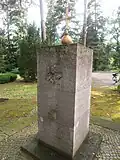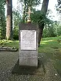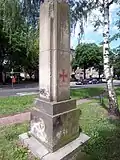 ![]() Das auch „Franzosenkreuz“ genannte Denkmal erinnert an die 400 französischen Kriegsgefangenen aus dem Deutsch-Französischen Krieg von 1870/1871, die in Spandau an den Pocken gestorben sind. Das Kalksandstein-Denkmal wurde von den Mitgefangenen errichtet. 1932 wurde es restauriert und vom ursprünglichen Ort, dem Friedhof der Garnison- / St. Johannisgemeinde (heute: Koeltzepark) an der Neuendorfer Straße, auf den Friedhof „In den Kisseln“ (Abt. 48a) umgesetzt. Inschrift: Souvenir Eternel / a nos / Frères d’armes / 1870–1871 (stark verwittert, kaum leserlich). Die Querbalken des Kreuzes tragen beiderseits die vergoldeten Inschriften: Erigé par leurs compatriots und In cruce salus |