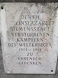 | Auf dem Spandauer Friedhof „In den Kisseln“ befindet sich das Denkmal im nordwestlichen Bereich, im Ehrenfeld für die im Lazarett Siemensstadt verstorbenen Opfer des Ersten Weltkriegs. Das von dem Unternehmen Siemens gespendete Ehrenmal befand sich ursprünglich auf dem heute aufgegebenen Friedhof Haselhorst an der Nonnendammallee und wurde 1961 unter Umbettung der Kriegsopfer in die Abt. 51 auf den Friedhof In den Kisseln versetzt. 1985 wurde es mit einer Spende von Siemens restauriert. Inschrift (Text in Versalien): Den im / Vereinslazarett / Siemensstadt / verstorbenen / Kämpfern / des / Weltkrieges / 1914–1918 / zu / ehrendem / Gedenken. |
