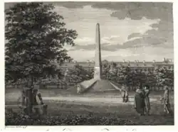 Diese Basreliefs sollten ursprünglich in Marmor ausgeführt werden, wurden jedoch nur aus Gips gestaltet.[3] Sie wurden an einem quaderförmigen Stein angebracht, der auf einem über zwei Stufen liegenden Sockel ruhte. Auf dem Quader, der „5 Schuh hoch und 4 Schuh breit war, lag eine 4 Zoll hohe Platte, die mit 3 Schuh und 8 Zoll Breite nicht den ganzen Quader abdeckte, und auf dieser Platte erhob sich ein 20 Schuh hoher Obelisk“. An den vier Seiten dieses Obelisken waren die Inschriften zu den einzelnen Reliefs in goldener Schrift angebracht, außerdem trug jede Seite den Namenszug des Herzogs. Das Denkmal wurde auf einer Rasenerhöhung auf der Planie aufgestellt; eine Gesamtdarstellung des Anblicks von der Oberamtei aus wurde von Jakob Gauermann gezeichnet und geätzt.