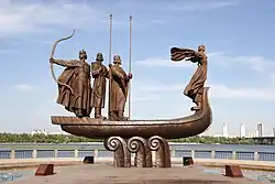 Es stellt ein neun Meter langes Boot dar, dass von drei Wellen getragen wird. Im Heck des Bootes stehen die Brüder Kyj, Schtschek und Choriw, während die Schwester Lybid am Bug des Bootes mit ausgebreiteten Armen steht.[1]