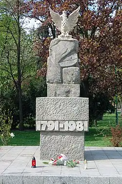 Nach dem Zweiten Weltkrieg wurde das Denkmal in den Hintergrund des Platzes versetzt und verschwand unter Büschen. Im Jahr 1981 wurde es restauriert und an den ursprünglichen Aufstellungsort zurückversetzt. Im Zuge der Restaurierung bekam es einen Sockel mit der Inschrift 1791–1981. Das Denkmal wird von einem steinernen Adler gekrönt der von Witold Marcewicz geschaffen wurde.