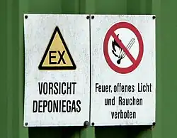 Rauchen, offenes Licht und Feuer darf in nicht geschützten und überwachten Räumen auf der Deponie nicht gestattet werden. In Gebäuden, Räumen, Schächten oder sonstigen Anlagen auf der Deponie, in denen eine Gasentwicklung möglich ist, ist strikt darauf zu achten, dass Rauchen, offenes Licht und Feuer oder sonstige Handlungen, die eine Explosion oder Feuer auslösen können, unterlassen werden. Die Einhaltung Unfallverhütungsvorschriften (GUV-R 127, vormals GUV 17.4)[3] und entsprechende Betriebsanweisungen sind unbedingt zu beachten.