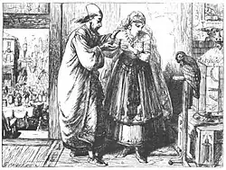 Papageien haben im Erzählgut oft erotischen Bezug. Als Reittier des indischen Liebesgotts Kamadeva verrät er in Liebesgeschichten Geheimnisse. Im Papageienbuch (Tuti nameh) hält er die Frau vom Ehebruch ab.[1] In europäischen Märchen sind Papageien naturgemäß selten. Doch auch bei Étienne de Bourbon entlarvt er einen flirtenden Knecht, und in einem anderen Exempel lässt die untreue Frau ihn töten.[2] Hedwig von Beit nennt den Papagei – nach C. G. Jung – ein Bild der Rätselhaftigkeit des aus dem Unbewussten redenden Geists.[3]