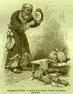 Hamdi Bey hat sich beim Bild Der Schildkrötenerzieher möglicherweise von einem auf einer japanischen Gravur basierenden Druck, der 1869 in der französischen Zeitschrift Le tour du monde abgebildet war, inspirieren lassen.[1] Diese Abbildung Charmeur de tortues von L. Crépon stellt einen Mann dar, der Schildkröten mit seiner Trommelmusik „beschwört“.[3][1][4]