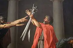 Der Schwur, den David darstellt, kommt bei Livius allerdings nicht vor, auch nicht bei einem der anderen Autoren (z. B. Plutarch, Valerius Maximus und Dionysios von Halikarnassos). Selbst in dem Theaterstück „Horace“ des Dramatikers Pierre Corneille wird er nicht gezeigt. Dieses 1640 in Paris uraufgeführte Stück, das als eigentliche Themen den Patriotismus und die Macht des Volkes zum Inhalt hatte, war der Pariser Gesellschaft zur Zeit Davids gut bekannt und der Künstler selbst war von dieser Aufführung begeistert. Damit hatte David sein Motiv für den staatlichen Auftrag gefunden und begab sich eigens mit seiner Familie nach Rom, um sich ganz in die Formenwelt der Antike einzusehen.[1]