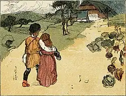 Zwei arme Waisenkinder betteln an der Tür einer alten Frau, die sie aufnimmt, nur darf ihr Mann nichts merken, der sie fressen würde. Der brüllt nachts, dass sie ihm keinen Menschen gebraten hat. Morgens geht die Frau aus, die Kinder sollen ihr elf Zimmer kehren, nur das zwölfte ist verboten. Durchs Schlüsselloch sehen sie darin einen goldenen Wagen mit goldenem Rehbock. Damit fahren sie davon. Als sie der Frau und dem Menschenfresser begegnen, verwandelt das Mädchen sich und ihren Bruder in eine Rose, daran sticht sich die Alte. Sie kommen zu einem Backofen, einem Birnbaum und einem Weinstock, die ihnen Brot, Birnen und Trauben geben. Der Wagen hat die Eigenschaft, dass überall Gaben gespendet werden, der Menschenfresser und seine Frau hatten ihn einst geraubt. Sie merken, dass er fehlt und verfolgen die Kinder. An einem Teich lässt das Mädchen Enten eine Brücke machen, sie fahren darüber. Der Menschenfresser macht es nach, die Enten lassen ihn und die Frau versinken.