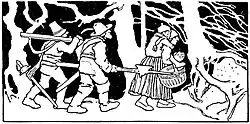Der zweijährige Hans und seine Mutter werden von Räubern in eine Höhle entführt, wo sie den Haushalt führen muss. Als Neunjähriger fragt Hans die Mutter nach seinem Vater, dann den Räuberhauptmann, der ihn lachend ohrfeigt, dass er hinfällt. Ein Jahr später fragt Hans wieder, verprügelt die betrunkenen Räuber mit seinem Knüppel und geht mit der Mutter zum Vater heim. Dort baut er mit ihm von dem mitgebrachten Gold ein neues Haus und arbeitet tüchtig. Er geht mit einem zentnerschweren Stab fort und begegnet einem, der Tannen zu Seil dreht und einem, der sich mit der Faust ein Haus in Fels haut. Sie vereinbaren, zusammen zu jagen, wobei immer einer daheim kochen muss. Die zwei anderen werden beim Kochen von einem Männlein heimgesucht, das Fleisch fordert und sie verprügelt. Als die Reihe an Hans kommt, gibt er ihm großzügig. Als es doch auf ihn losgeht, verfolgt er es bis zu seiner Höhle im Berg. Dort lässt er sich am nächsten Tag von den zwei anderen an einem Seil herab und befreit eine Königstochter, indem er den Zwerg tötet. Als die zwei ihn zurücklassen und mit der Königstochter fortsegeln wollen, nimmt er ihm auch einen Wunschring ab, der ihn aus der Höhle bringt. So befreit er die Königstochter erneut und sie heiraten.